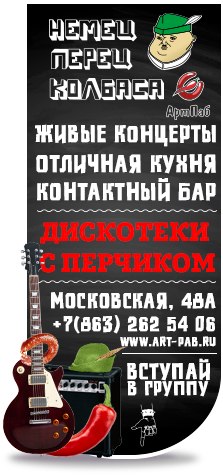 Арт-Паб «Немец Перец Колбаса» – не обычное заведение общепита. Хотя простая, вкусная и недорогая кухня – наш конек. Кроме кулинарии и отличного выбора качественного пива мы предлагаем своим клиентам демократичную и артистичную атмосферу для отдыха. К вашим услугам живая музыка любых направлений (кроме русских шансона и попсы), арт-вечеринки, рок-дискотеки и многое другое.